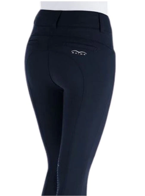 The Naspre knee patch breech has a flattering euroseat with faux pockets that give style without bulk. A small embroidered Animo logo is located below the left rear pocket. The front of the Animo Naspre has functional pockets with tonal embroidery thread detail. Women’s equestrian riding breeches feature a wide waistband with belt loops that can accommodate your favorite belts. Breeches have a zip front and 2-button closure with enameled Animo logo buttons. The Naspre has a stretch sock at the lower leg for a sleek fit under riding boots. Animo Naspre Knee Grip breeches have silicone patterned knees for a flexible, secure feel in the saddle. In Ombra (dark blue), Taupe, Calla, Cuba (dark khaki), and Nero black.