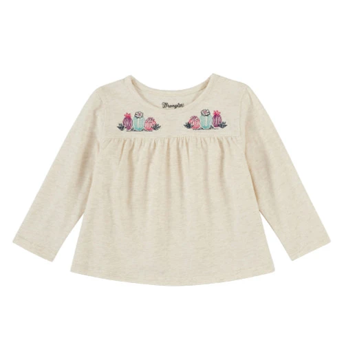 Wrangler Baby Cactus Embroidery Tee in infant and baby sizes is a long sleeve top with delicate flowering cactus embroidery at the front yoke. The soft oatmeal heather color is on trend for an upscale, contemporary look.