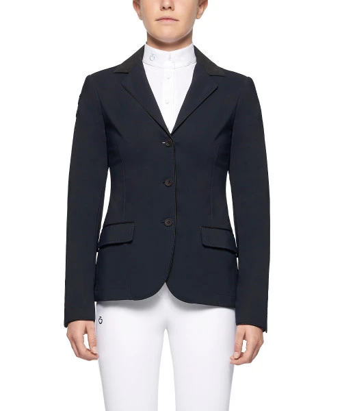 Cavalleria Toscana considers every detail to give the young rider a professional look at the highest level of competition. The GP Young Rider Jacket has lined sleeves and a semi-attached lining at the shoulders. There is a different lining inside the lapels that helps achieve good structure and a flat profile. Top quality show coat for girls has interior seams that are completely finished with binding tape. The GP Young Rider Jacket for girls from Cavalleria Toscana is lightweight, breathable, and stain resistant. Children’s horse show jacket Navy, or Black has multi-ring versatility and obvious quality for rider confidence.