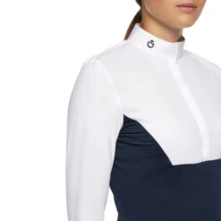 Elegant and on point for the hunter arena, the Cavalleria Toscana Hunter Competition Long Sleeve Shirt provides perfect comfort and stretch for riders. Women’s long sleeve hunter show shirt has a wrap collar and cuffs in white cotton poplin. he body and sleeves of the Cavalleria Toscana competition shirt are stretch tech jersey.