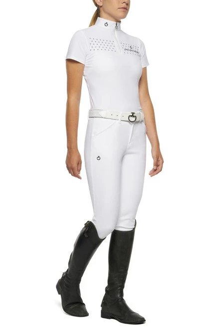 Cavalleria Toscana Girls Flock Dot Polo Shirt with Short Sleeves is perfect for summer equestrian competition. Children’s quarter zip horse show polo from Cavalleria Toscana has polka dots in a band across the front, with the Cavalleria Toscana name and logo. The print is in a soft, flocked fabric in contrast colors.