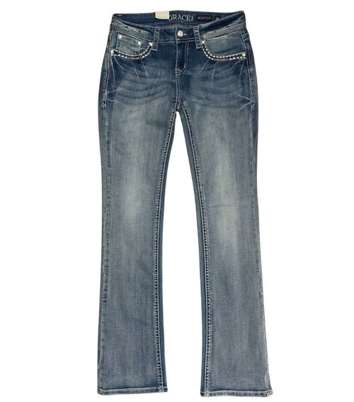 Grace in LA Junior Fit Jean is embellished with embroidery, small crystals, and chic whitewashed logo hardware. Western bootcut denim jeans have a classic zip fly and button front and five pocket styling. The back pockets have authentic Western flair with an embossed steer head and horns design accented with crystals, stones, and embroidery. The beautiful high-end Grace in LA Junior Fit Steer Head Pocket Jean is here at Mary’s at a surprisingly low price!