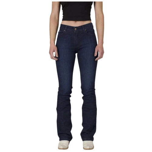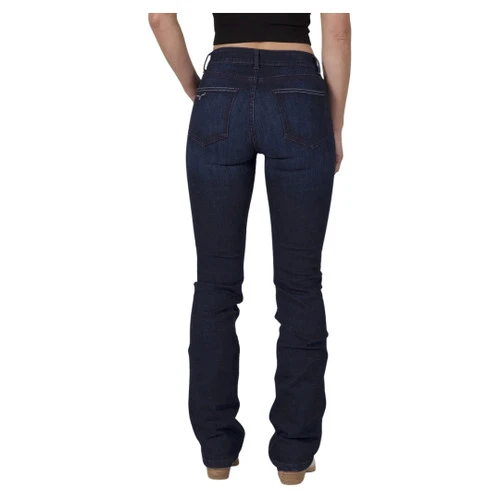 Women’s Kimes Ranch Audrey Low Rise Bootcut Jean in dark wash with low key styling is a performance riding jean with slim fitted thigh and moderate bootcut that stacks. The dark blue wash with very light hand sanding has a nice, rich, deep hue. The Audrey presents a pared down profile and the only contrast stitching is across the top of the back pockets. The result is a low key look that is perfect for Western showing.