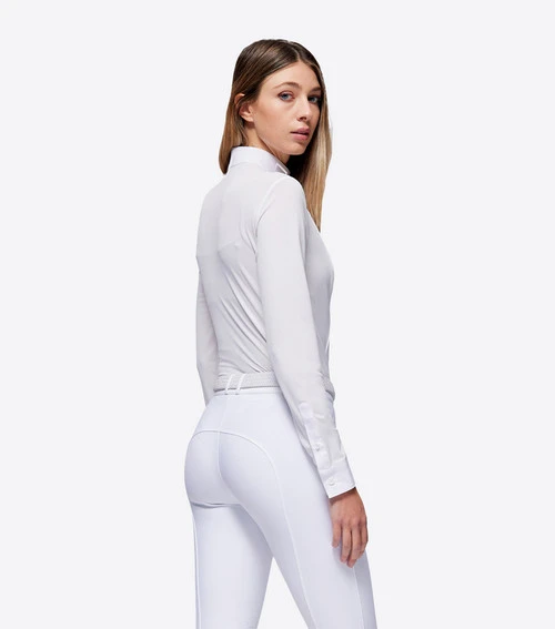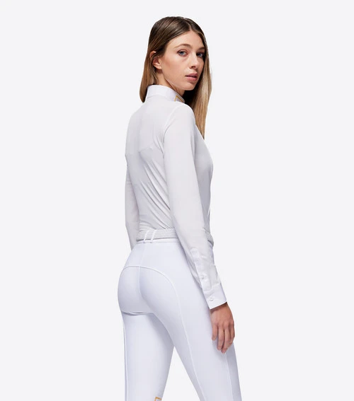 Women’s RG Mesh Long Sleeve Competition Shirt has classic, elegant style plus amazing ventilation and athletic function. RG Rider’s Gene from Cavalleria Toscana offers fresh and modern designs in premium fabrics. Unique brand accents, a flattering fit, and smart features are all part of the RG look. The Mesh Competition Shirt comes in two versions, with a white logo rectangle on the collar or with a yellow/orange logo rectangle on the collar.