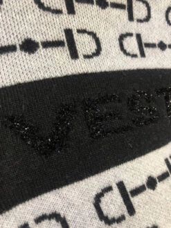 Vestrum Montagna Turtleneck has striking equestrian flair with a black bit intarsia pattern on a white background. The turtleneck and cuffs are solid black. A black stripe across the chest and sleeves has the Vestrum name and a logo in tonal metallic thread. Women’s Vestrum Montagna Turtleneck offers classing, sporting style with a modern edge.