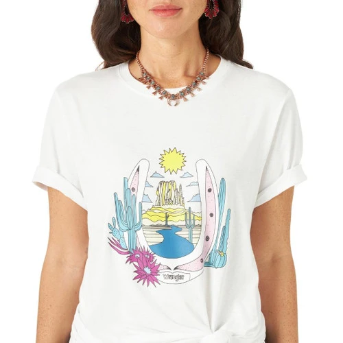 Women’s Wrangler Horseshoe Desert Tee is a short sleeve crewneck style. The T-shirt features a a graphic print of desert scenery framed by a horseshoe and cactus. The retro design has a nostalgic feel with a perfect summer vibe It’s cute and fun and easy to wear with jeans or shorts through summer and beyond.